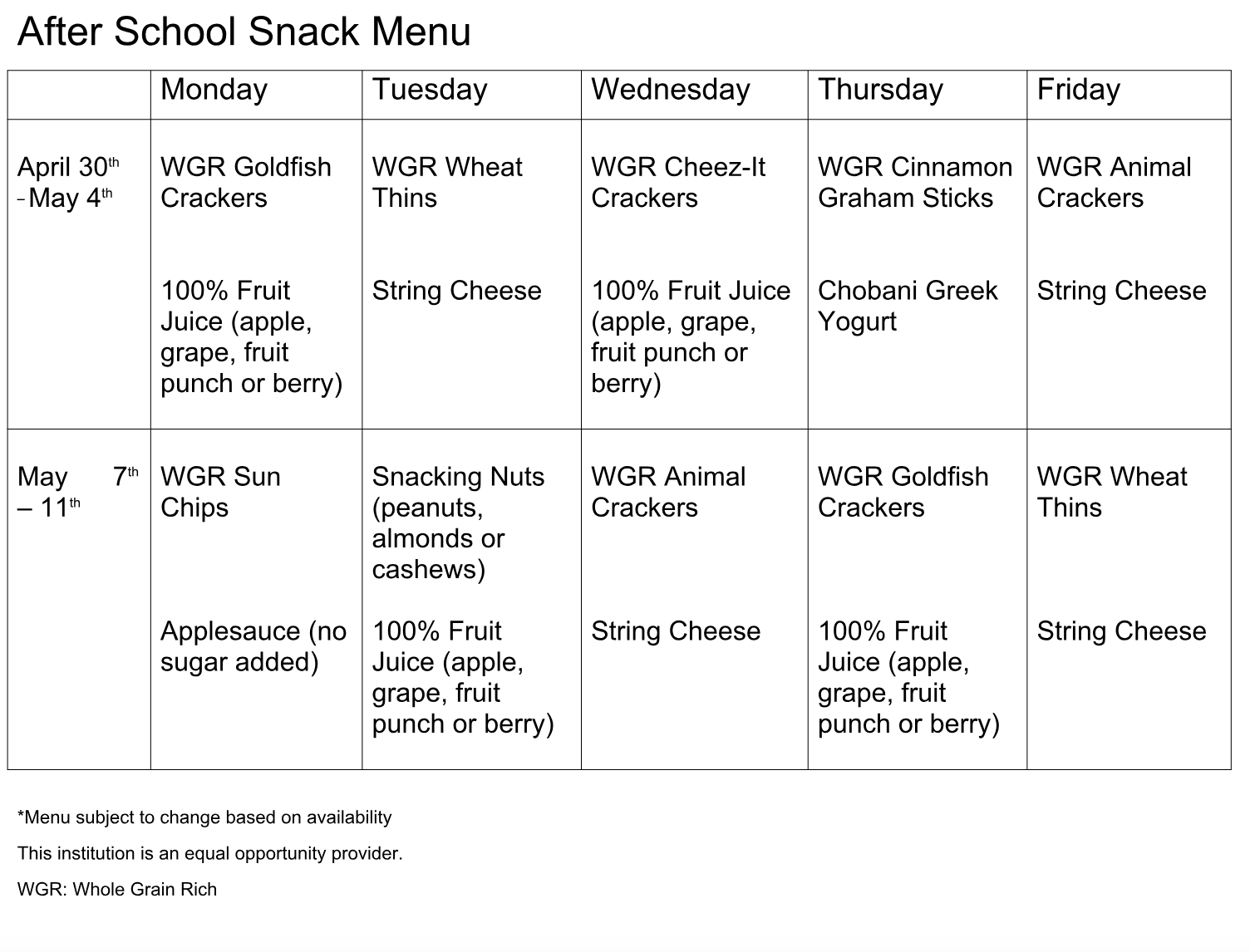 - School Year Snack