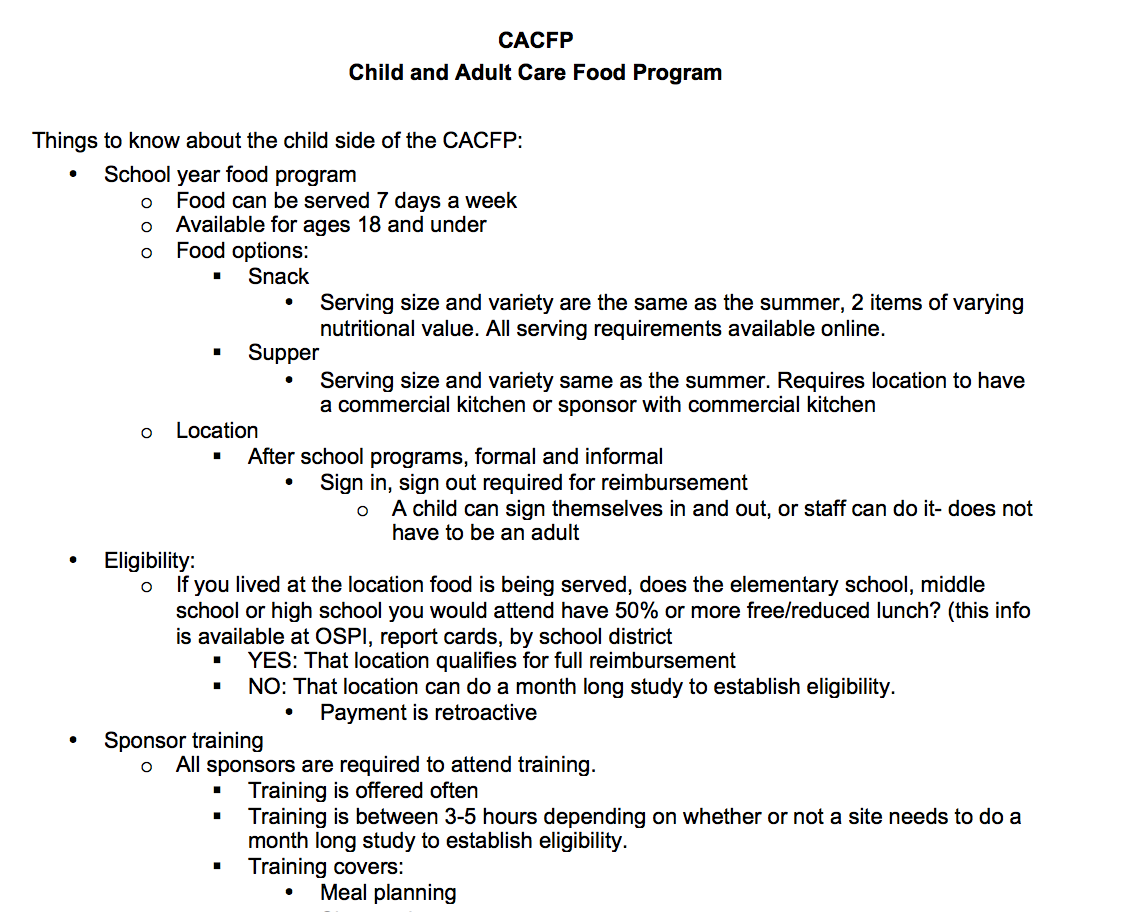 - In the Google Drive folder there's a handout for talking points about the CACFP