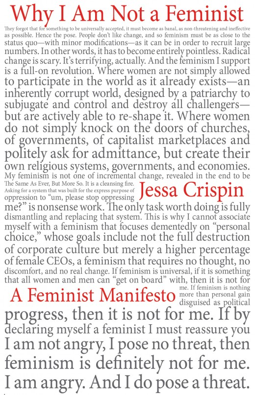 "Somewhere along the way toward female liberation, it was decided that the most effective method was for feminism to become universal. But instead of shaping a world and a philosophy that would become attractive to the masses, a world based on fairness and community and exchange, it was feminism itself that would have to be rebranded and remarketed for contemporary men and women."