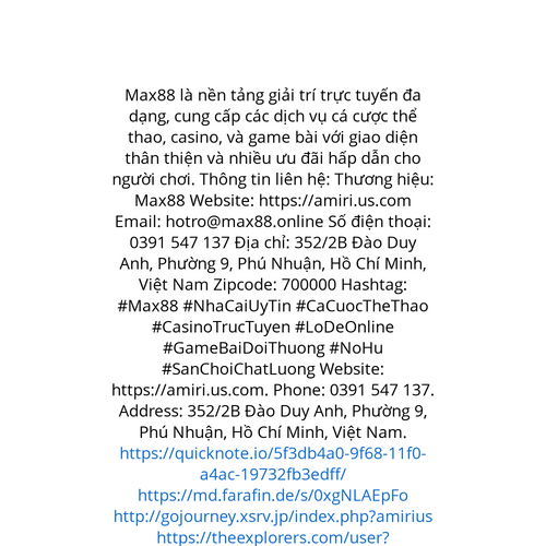 Website: https://amiri.us.com. Max88 là nền tảng giải trí trực tuyến đa dạng, cung cấp các dịch vụ cá cược thể thao, casino, và game bài với giao diện thân thiện và nhiều ưu đãi hấp dẫn cho người chơi. Thông tin liên hệ: Thương hiệu: Max88 Website:
