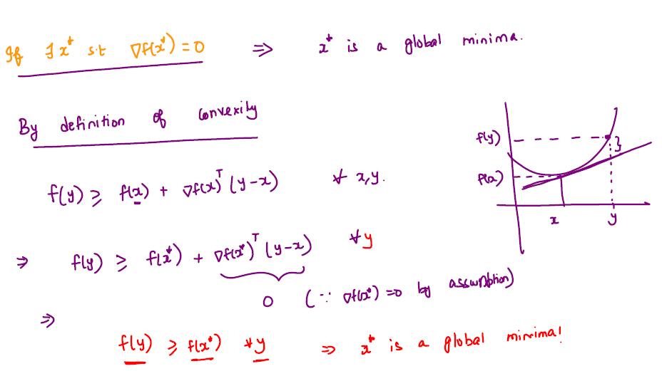 Let \(f\) be a differentiable and convex function from \(\mathbb R^d \rightarrow \mathbb R\), \(x^* \in \mathbb R^d\) is a global minimum of \(f\) if and only if \(\nabla f(x^*) = 0\).
