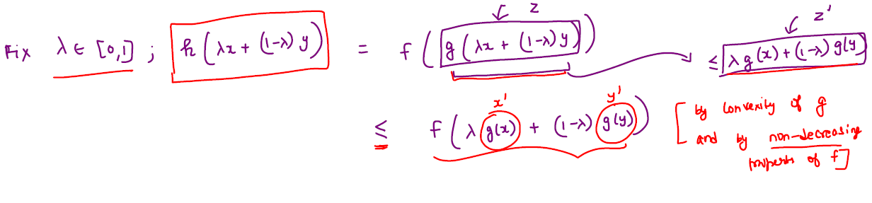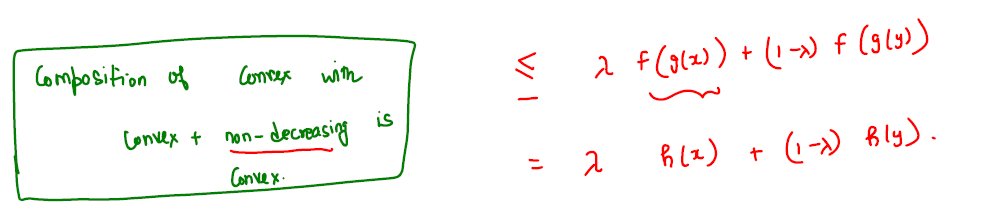 Let \(f: \mathbb{R} \rightarrow \mathbb{R}\) is a convex and non-decreasing function and \(g: \mathbb{R}^d \rightarrow \mathbb{R}\) be a convex function, then their composition \(h = f(g(x))\) is also a convex function.