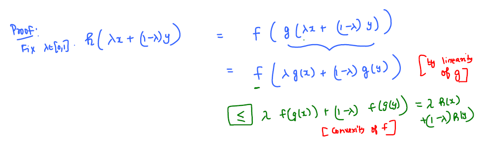 Let \(f: \mathbb{R} \rightarrow \mathbb{R}\) is a convex function and \(g: \mathbb{R}^d \rightarrow \mathbb{R}\) be a linear function, then their composition \( h = f(g(x))\) is also a convex function.