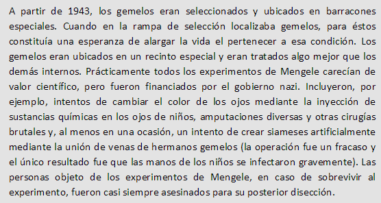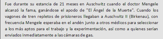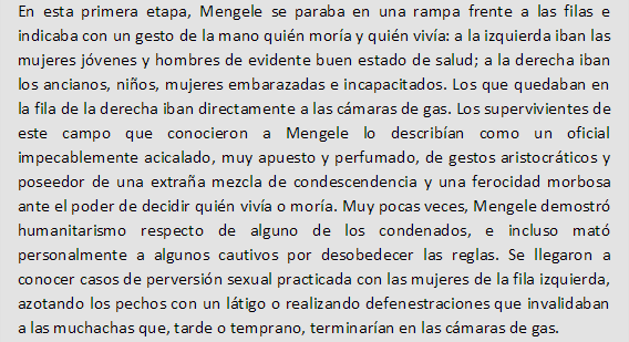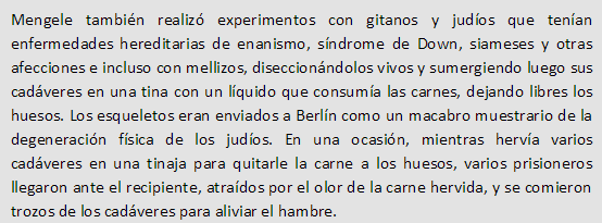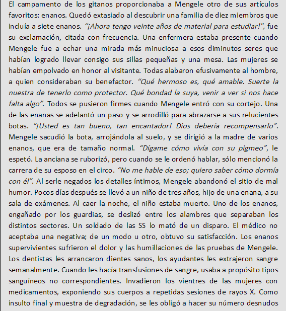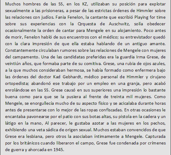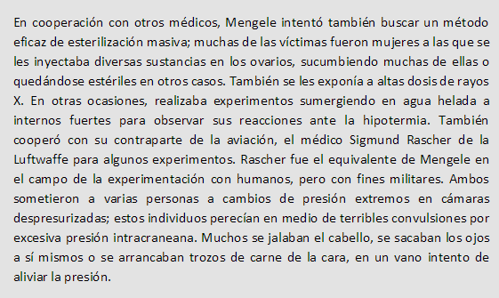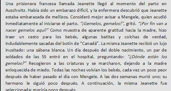 Mengele se mostro especialmente cruel con embarazadas, o con mujeres con hijos de los guardias. Si la mujer no sobrevivia, pero el feto si, lo mandaba directamente al horno para servir como combustible. Mas tarde cambio de opinion, y dejaba dar a luz a las madres, para despues mandar a los bebes nacidos a ciertos tipos de experimentacion en otros campamentos. Incluso llego a prohibir a ciertas madres no amamantar bebes para recaudar informacion sobre muerte de inanicion de bebes.