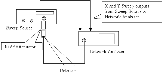 Step 1. Set the sweep source to the required frequency range. Make sure that the output of the sweep source is within the desired amplitude limits, otherwise, it may saturate the detector head and any measurements taken would not be accurate. You may use an attenuator at the output of the sweep source to mitigate any problem that may arise due to mismatch between the cable under test and the sweep source.