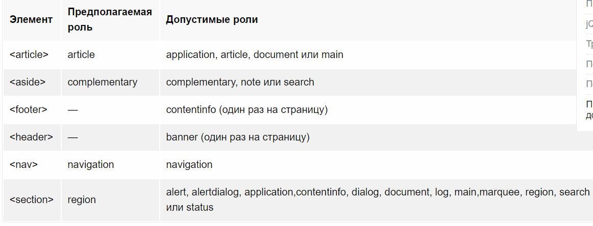 Роли WAI-ARIA делятся на четыре различные категории: абстрактные, виджеты, структура документа и ориентиры. Роль структуры документа определяет организационную структуру содержимого на странице,ориентиры определяют регионы страницы.