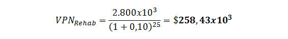 En este caso sólo tenemos que calcular el VPN para la rehabilitación pues, ciertamente, el costo de construcción ya está en valor presente. Por lo tanto: