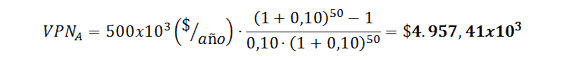 Los gastos de Operación y Mantenimiento, supuestos constantes durante toda la vida del proyecto (50 años), tendrán el siguiente Valor Presente Neto:
