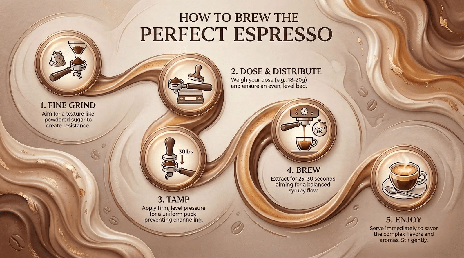 Create a professional process infographic showing ‘How to Brew the Perfect Espresso.’ Use an S-curve pattern to guide the eye from the top-left to the bottom-right. Include five steps, each with a small icon and a short label.