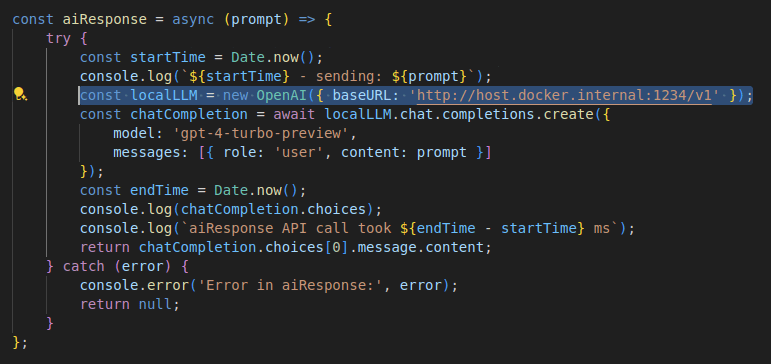 OK.. back to the present time - lets update that earlier code to point at a local service hosted by LM Studio using same contract as OpenAI apis. Now we can run our ChatGPT code against any local LLM.