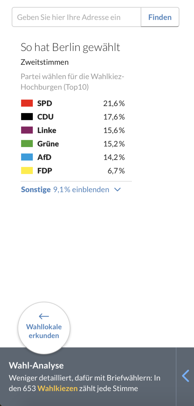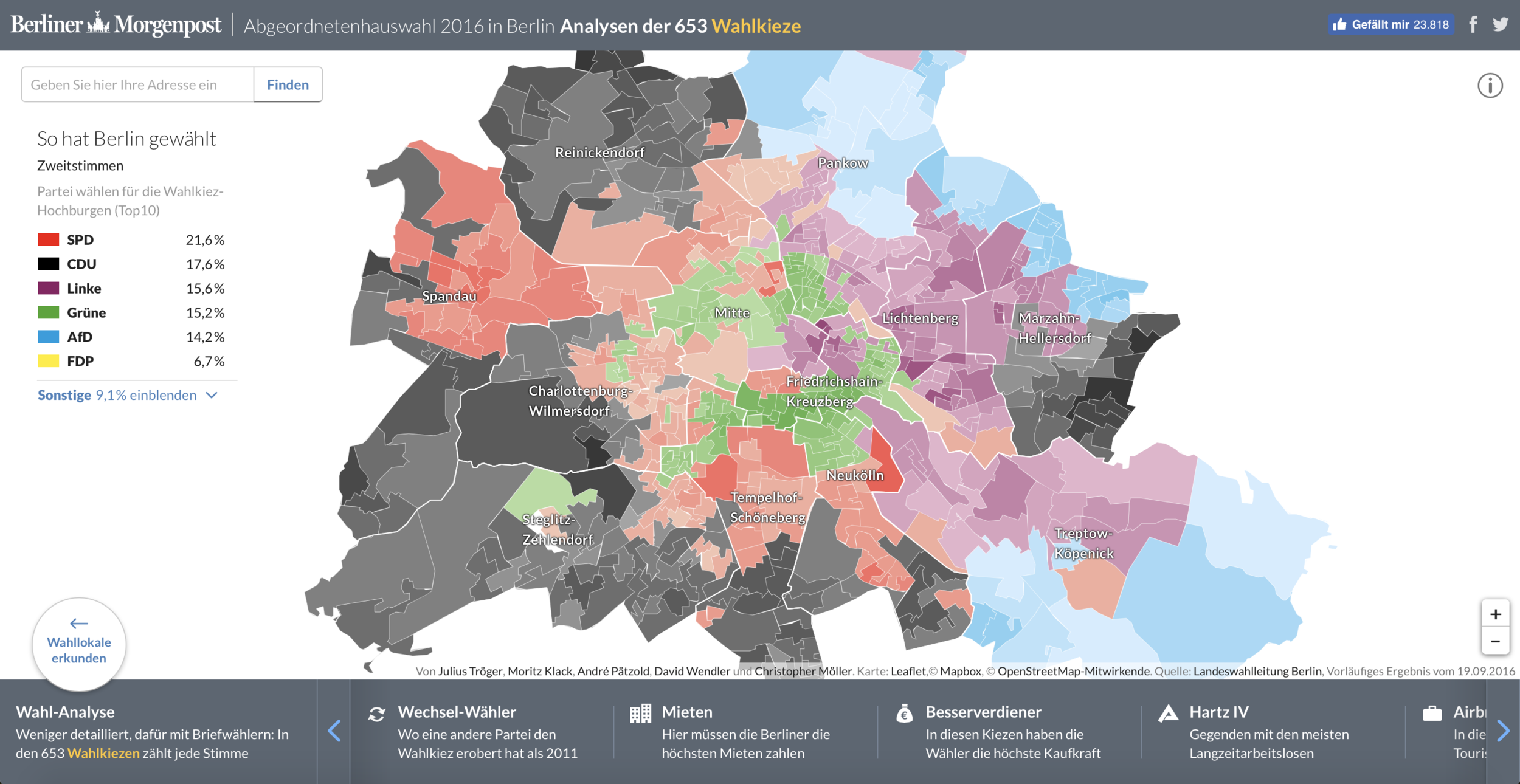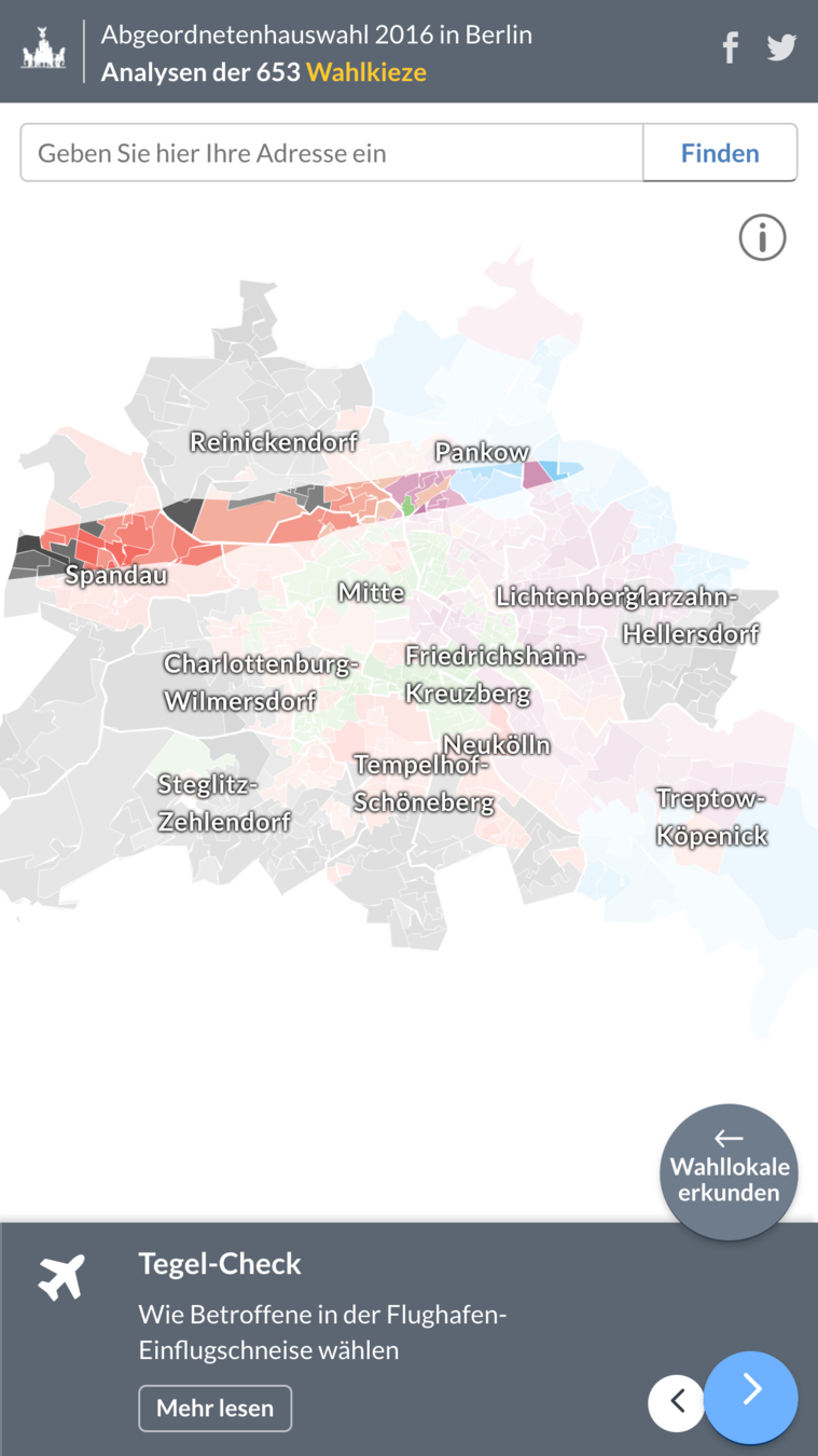 同樣是柏林早報的作品,用一張柏林地圖,呈現各黨在柏林州議會選舉各選區的得票情況。