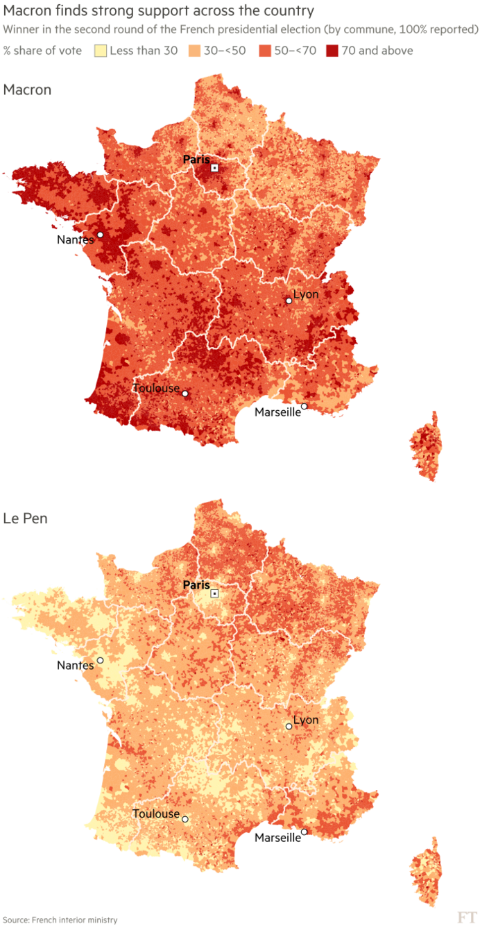 金融時報在去年法國大選結果揭曉後兩天推出選情分析,從兩位候選人的得票率,投票人在第一輪投票和第二輪的選擇有何不同到各選區所得水準與候選人得票率的關係,是非常詳盡的資料新聞報導。