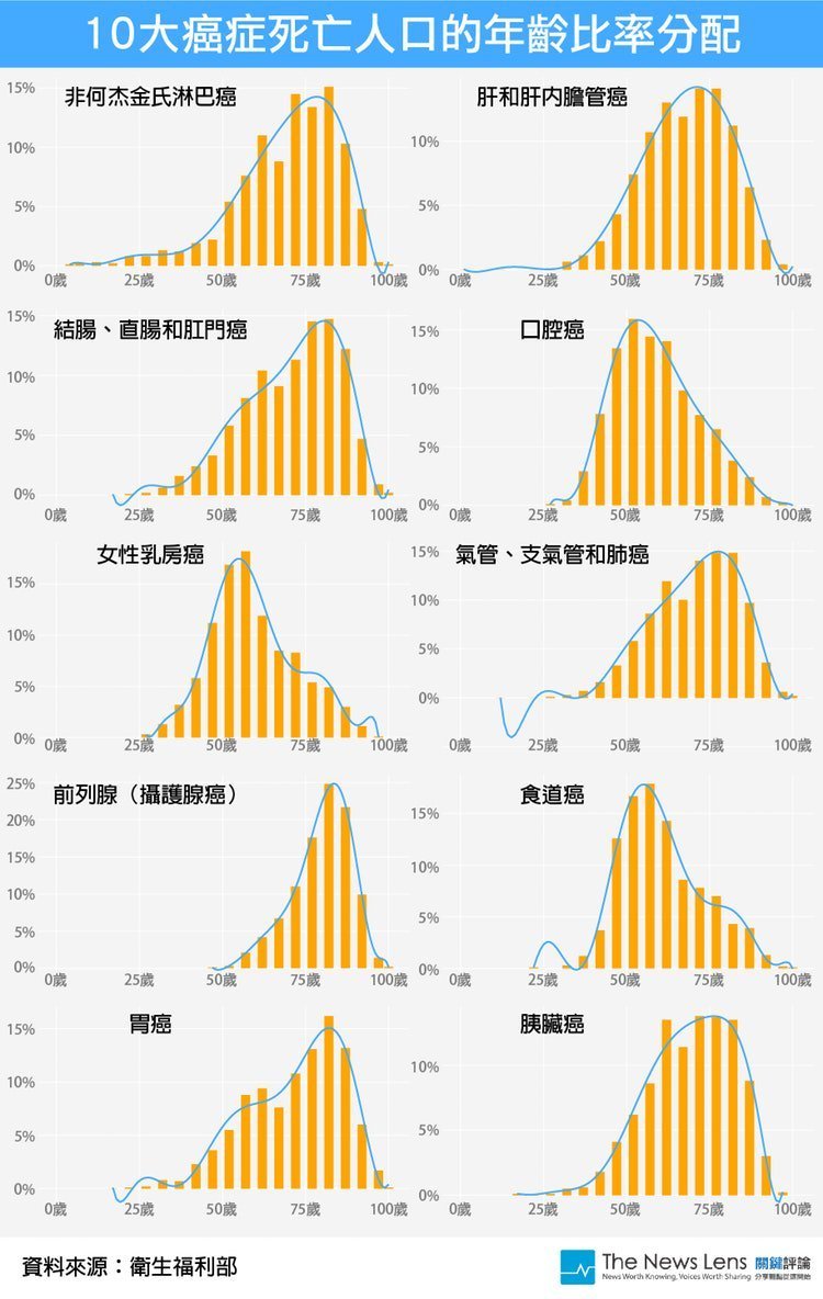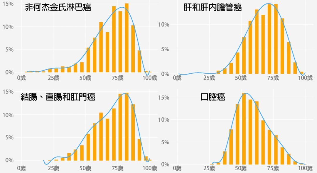 運用衛福部的2014年癌症死因資料,畫出十大癌症死亡人數的年齡分佈,搭配迴歸線,找出各大癌症的死亡年齡高峰。