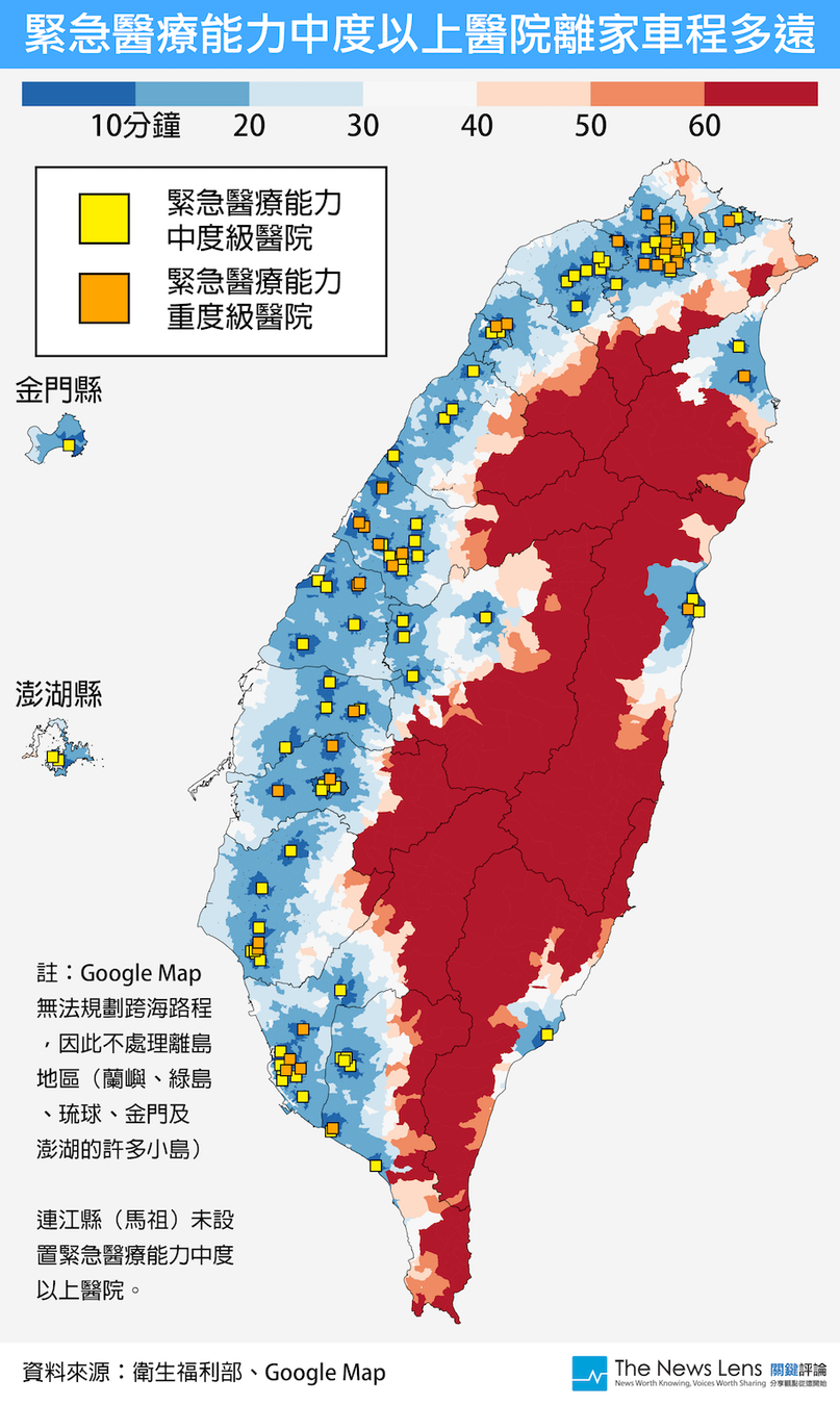在「你家開車到最近的大醫院要多久時間?3張圖帶你看全台緊急醫療資源差距」中,我使用衛福部的全台急救醫院資料,以及Google Map的路徑規劃功能,分析各縣市人口離緊急醫療資源的車程距離。