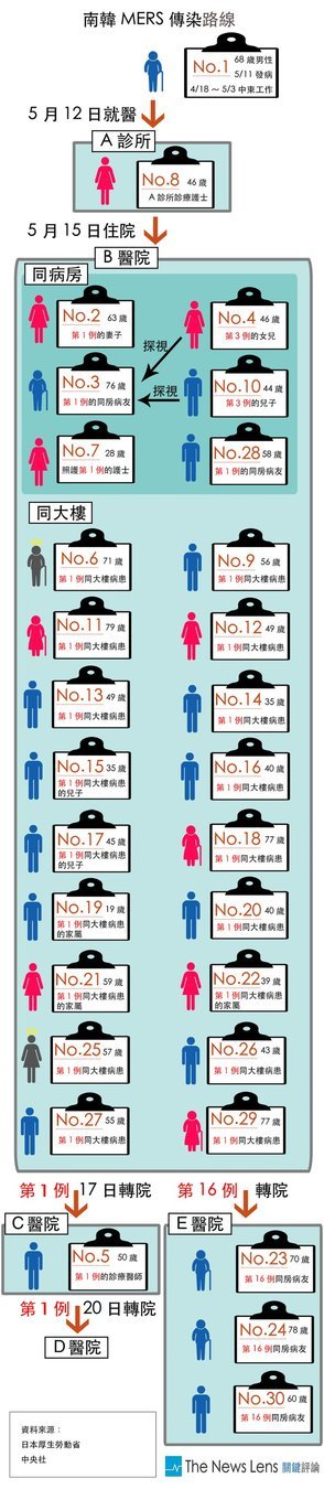 在「一張圖帶你看南韓30個MERS確診病例的傳播路線」中,我使用日本厚生勞動省公布的病例傳擾途徑資料,繪製資訊圖表,讓MERS擴散過程更好被理解。