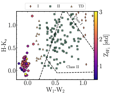 2MASS/WISE photometry and CMD positions indicate that candidates are not consistent with Class I/II YSO's...