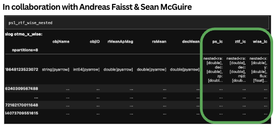Both Large Survey DataBase (LSDB) and Nested Pandas, are pivotal tools for the success of this study - providing: data exploration, discovery, and rapid analysis