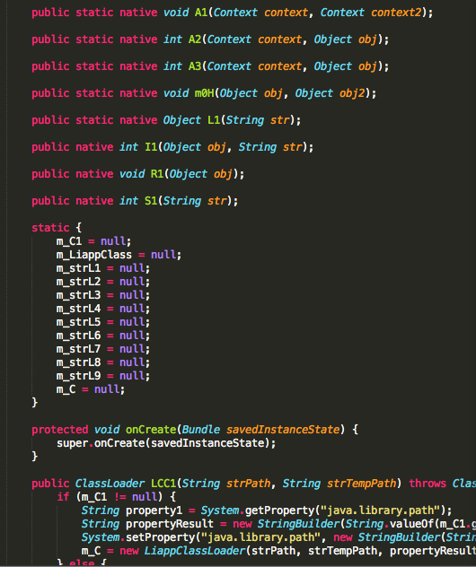 Developers can also manually conduct obfuscation, such as, using native code. They can further obfuscate the correlation between Java code and native code by registering JNI methods with semantically meaningless names in the JNI OnLoad function. [1]