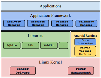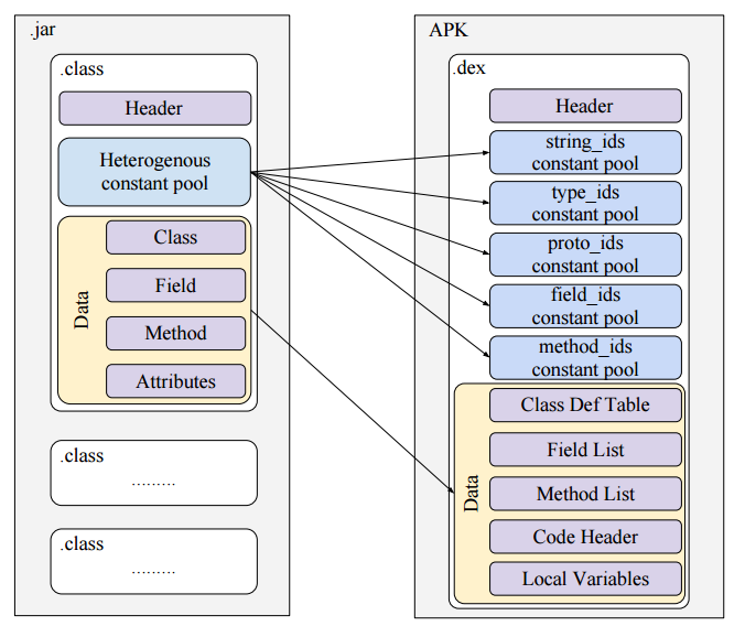 Android applications are written in java and executed in a Dalvik VM. The initial java files are first compiled into .class files, packed into a jar package and then compiled into .dex by the dx tool. The .dex file is then passed to the apkbuilder along with other assets and an APK file is created.