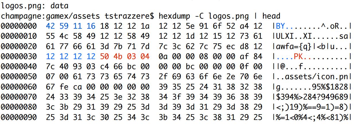 The first few bytes are rubbish. 50 4B 03 04 is the header magic number of a .zip archive.