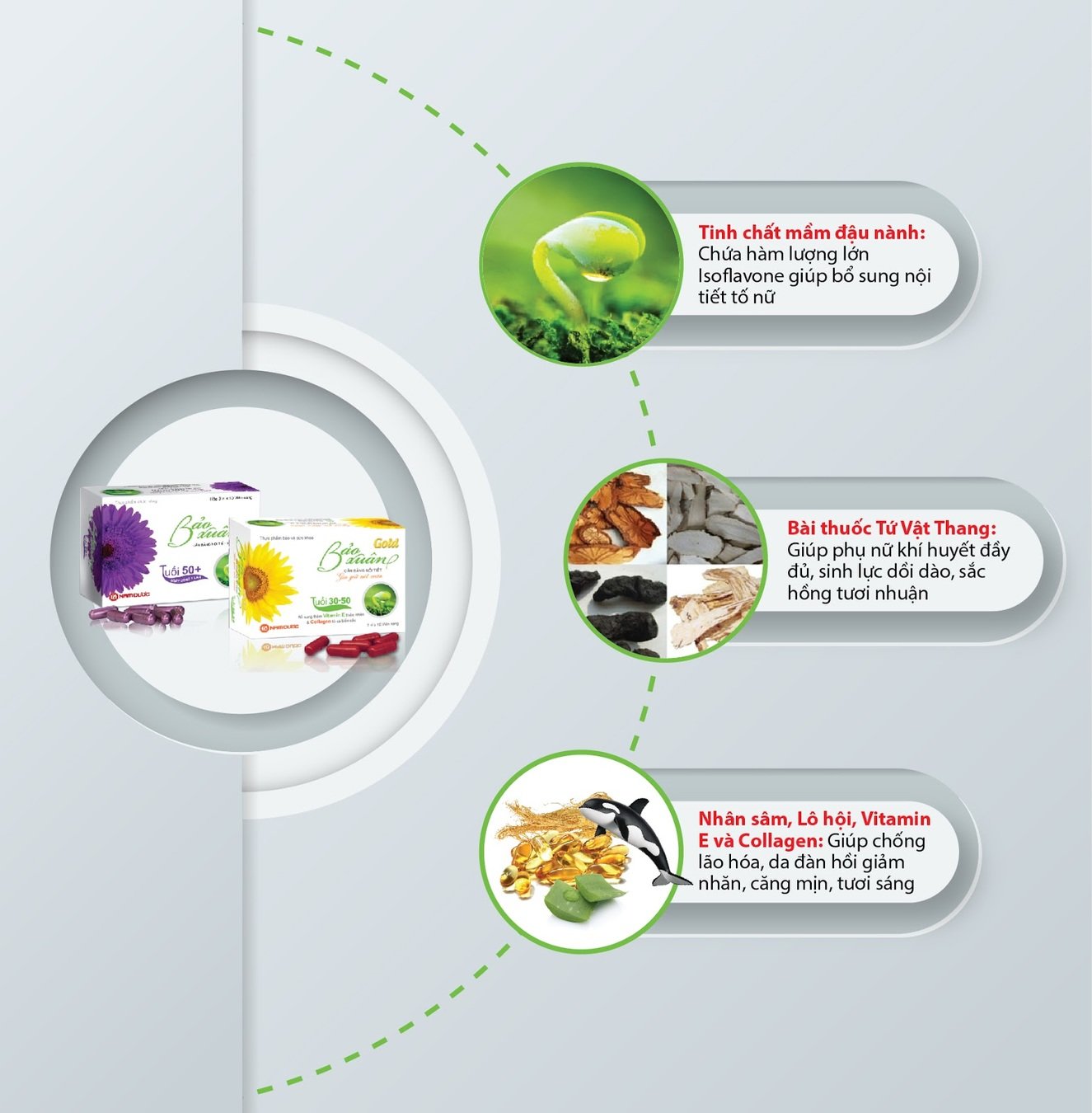 Viên uống Bảo Xuân Gold và Bảo Xuân 50+ đều được bào chế hoàn toàn từ thảo dược, không pha trộn tân dược nên rất an toàn. Sản phẩm có tác dụng bổ sung và cân bằng nội tiết tố nữ cho cơ thể, ngăn ngừa các triệu chứng rối loạn tâm sinh lý, tạo điều kiện cho chị em trải qua những ngày tháng mang bầu thuận lợi nhất. Hơn thế, Bảo Xuân là một số ít sản phẩm có thể dùng được ngay sau khi sinh để tăng hàm lượng estrogen mà không gây ảnh hưởng tới việc cho con bú.