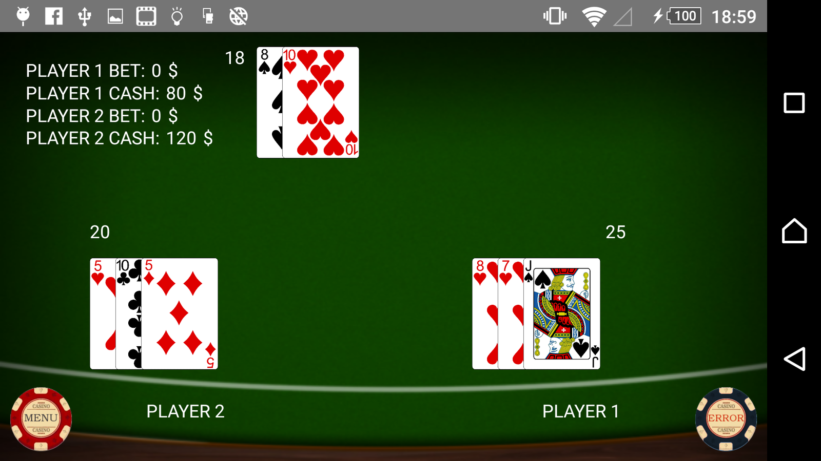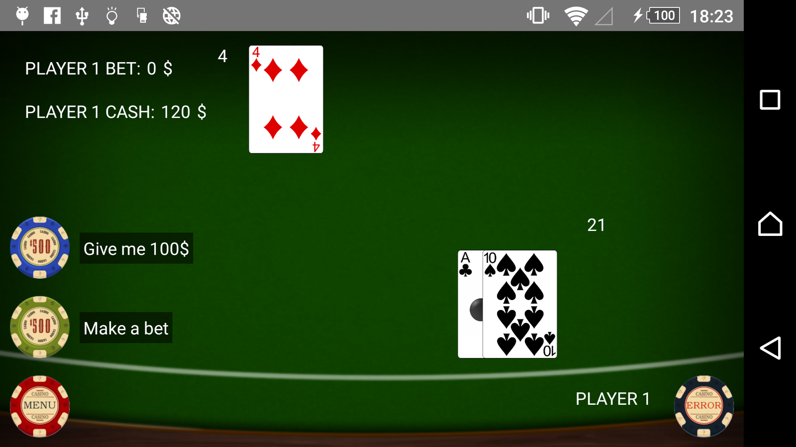 Aplikacja na Androida pozwalająca grać w BlackJacka używając komend glosowych samemu lub z partnerem.