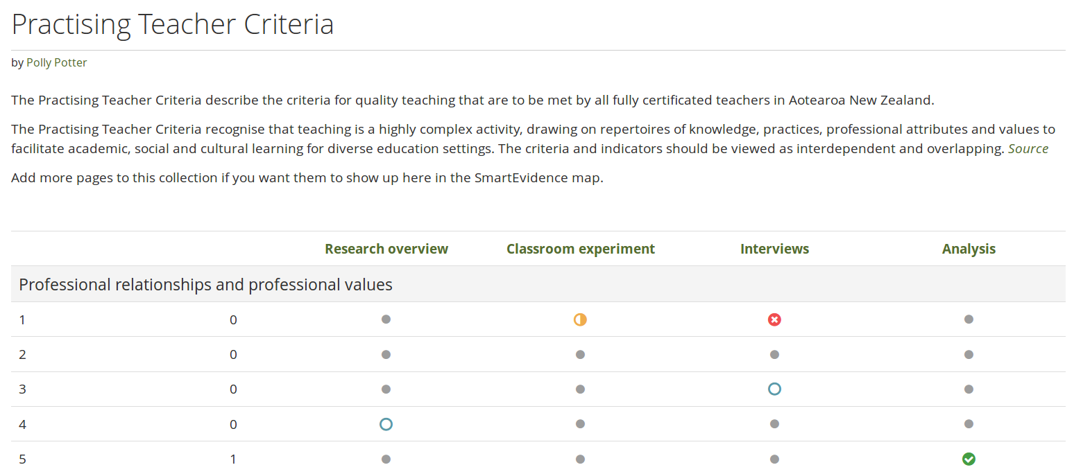 "description":"<p>The Practising Teacher Criteria describe the criteria for quality teaching that are to be met by all fully certificated teachers in Aotearoa New Zealand.</p><p>The Practising Teacher Criteria recognise that teaching is a highly complex activity, drawing on repertoires of knowledge, practices, professional attributes and values to facilitate academic, social and cultural learning for diverse education settings. The criteria and indicators should be viewed as interdependent and overlapping. <i><a href=\"http://educationcouncil.org.nz/content/registered-teacher-criteria-1\">Source</i></p>",