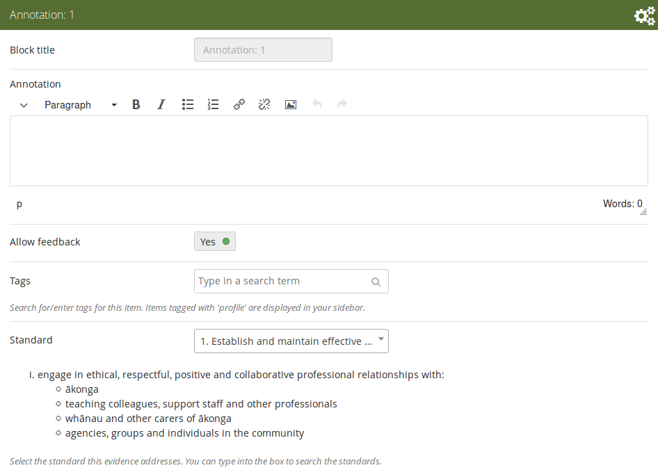 "description":"<ol type=\"i\"><li>engage in ethical, respectful, positive and collaborative professional relationships with: <ul><li>ākonga</li><li>teaching colleagues, support staff and other professionals</li><li>whānau and other carers of ākonga</li><li>agencies, groups and individuals in the community</li></ul></li></ol>",