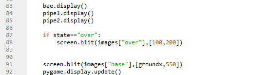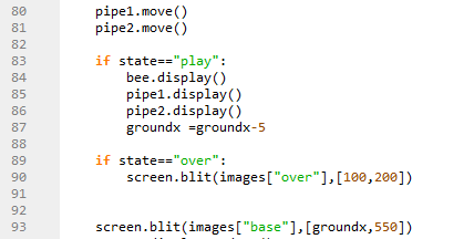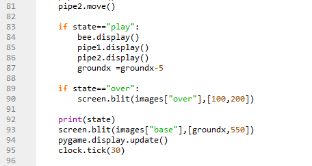 2. We only need to show pipes and bird in the play state, so move the display function inside the play state if block