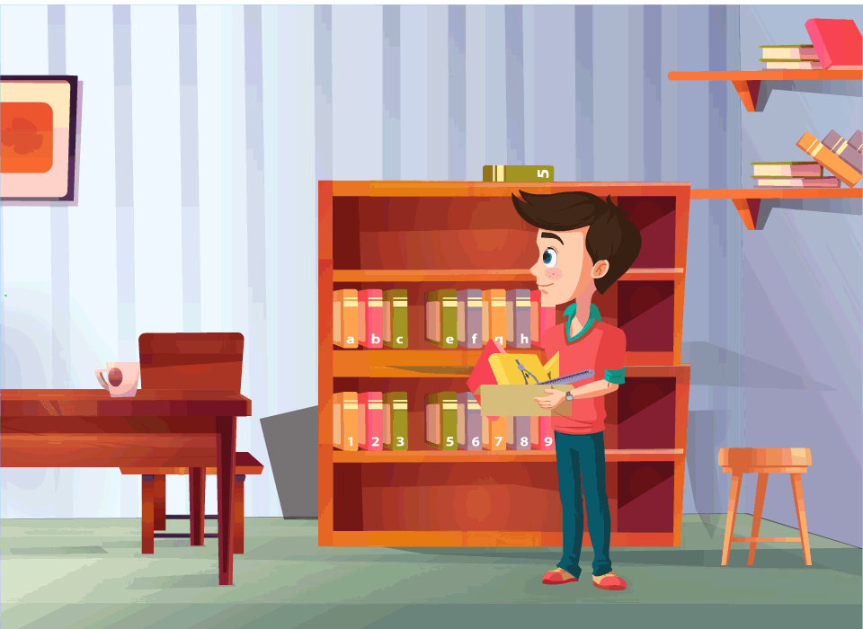 ***Note to illustrator*** 1. We need to show a boy trying to keep his study items like book, stationary box, pen stand, then again one more book in 1 square shaped container. 2.few moments later the boy goes back to find stationary box from the container and he finds all messy and empties the entire box to find it. 3. Her mother then comes to him and tells her that "I have created a shelf to place all your items sequentially where each section has a number written on it 1,2,3,4,5. She places all the above objects sequentially. She tells "With this container it can store multiple items of any type and they are identified easily bcoz they are placed in a separate section with an index no. " 4. The boy becomes happy and takes an object from the shelf positioned at index 3.