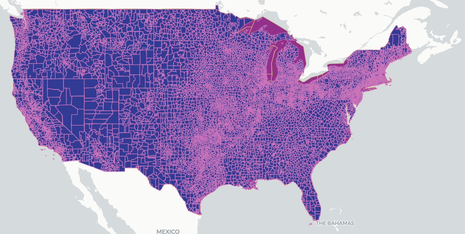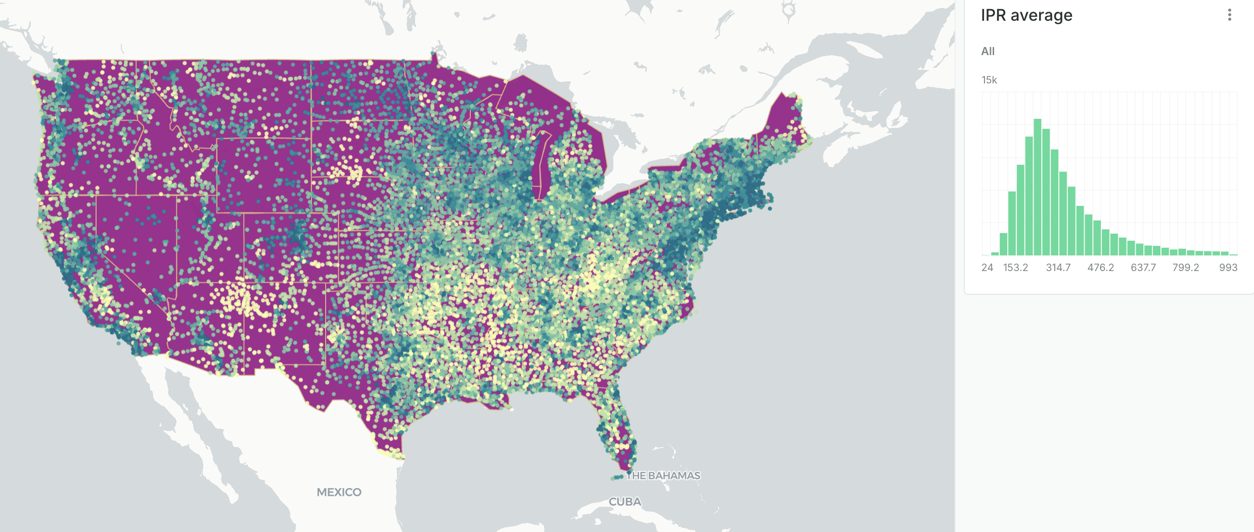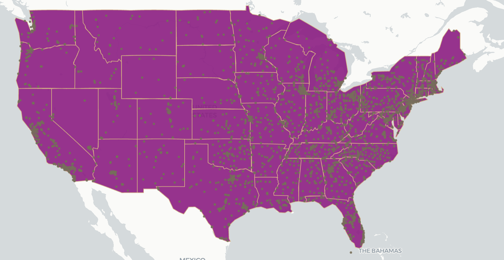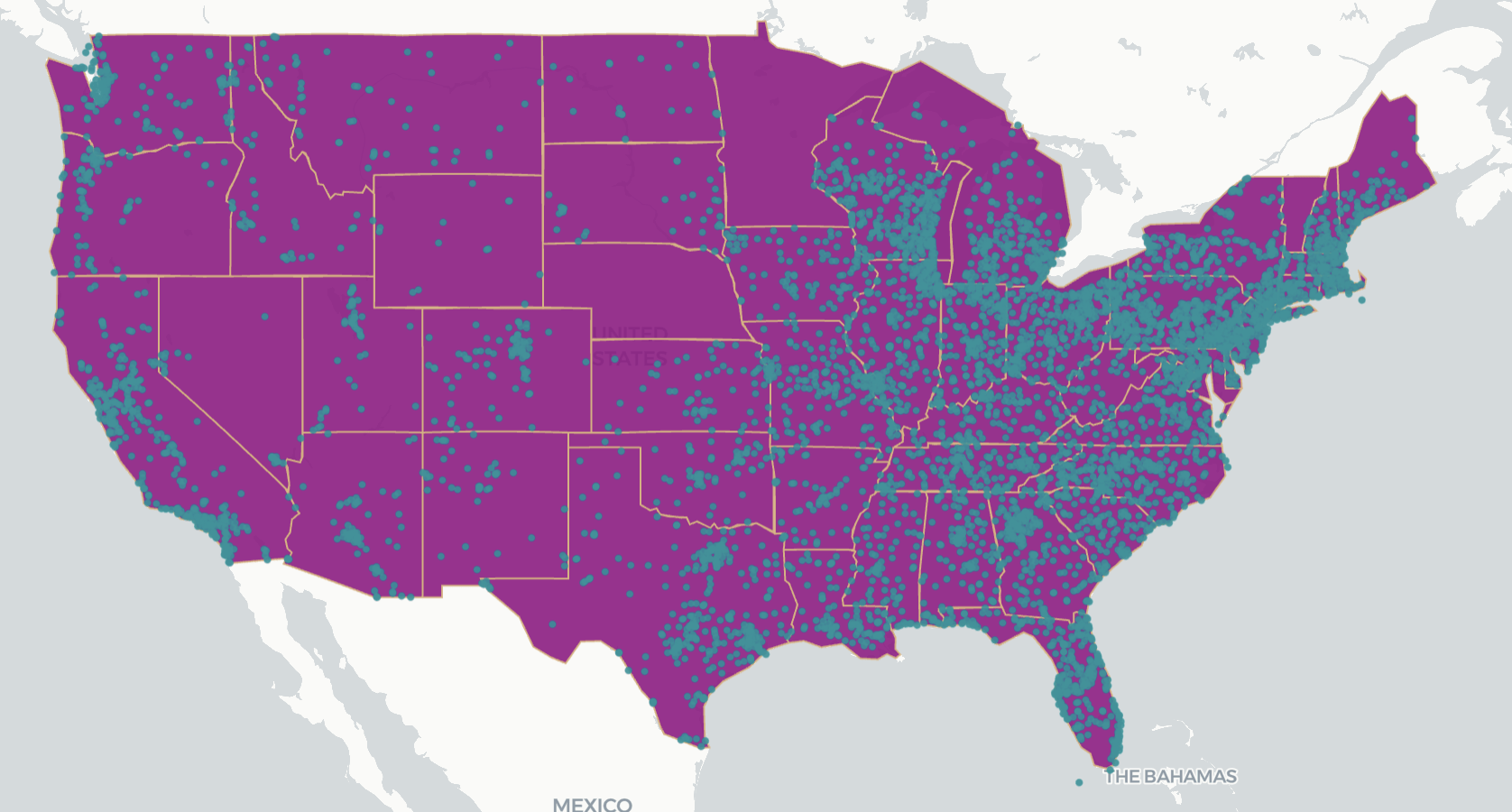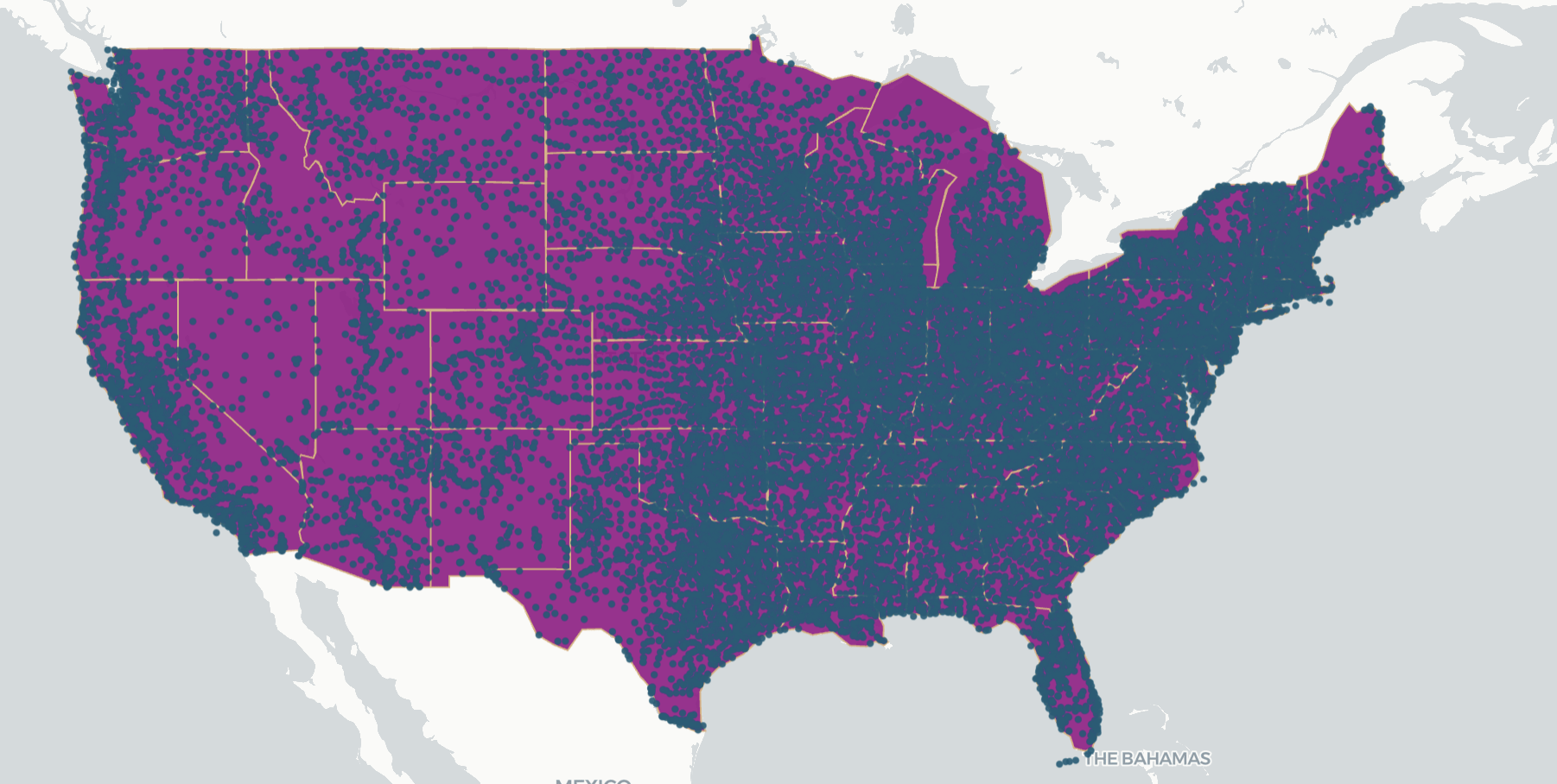 A point map of all public schools in the US are located overlayed on the state map.