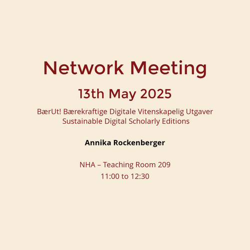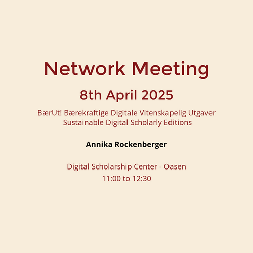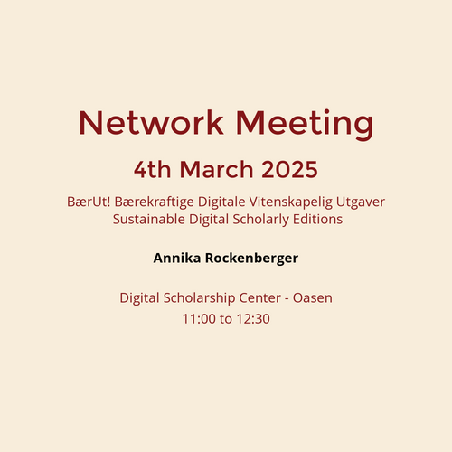 Presentation of BærUt! Sustainable digital scholarly editions. Network meeting information - March 2025. Design: Sofie Gilbert. Content: Annika Rockenberger. CC-BY 4.0