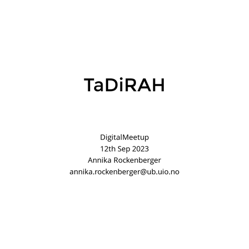Presentation of TaDiRAH Taxonomy of Digital Research Activities in the Humanities. DigitalMeetup at the Dept. of Archaeology, Conservation and History, University of Oslo, on Sep 12th, 2023 by Annika Rockenberger.