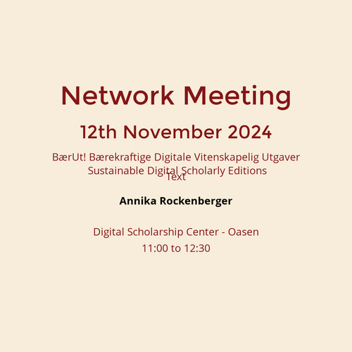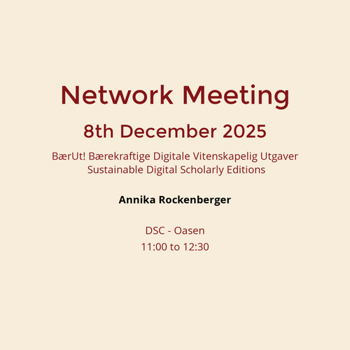 Presentation of BærUt! Sustainable digital scholarly editions. Network meeting information - November 2024. Design: Sofie Gilbert. Content: Annika Rockenberger. CC-BY 4.0
