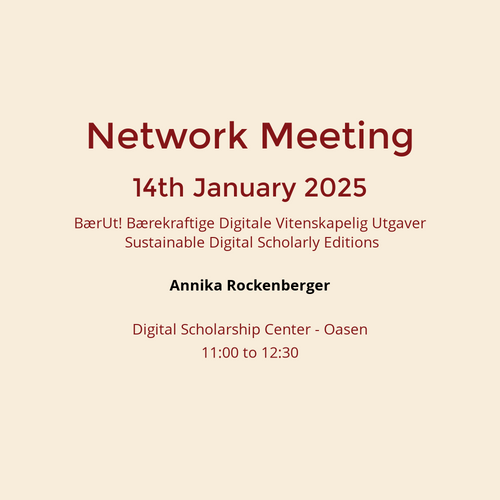 Presentation of BærUt! Sustainable digital scholarly editions. Network meeting information - January 2025. Design: Sofie Gilbert. Content: Annika Rockenberger. CC-BY 4.0