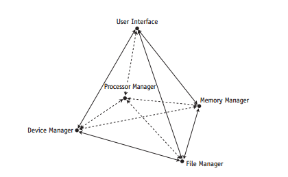 Este modelo de un sistema operativo sin red muestra cuatro gestores de subsistema sosteniendo la interfaz de usuario.