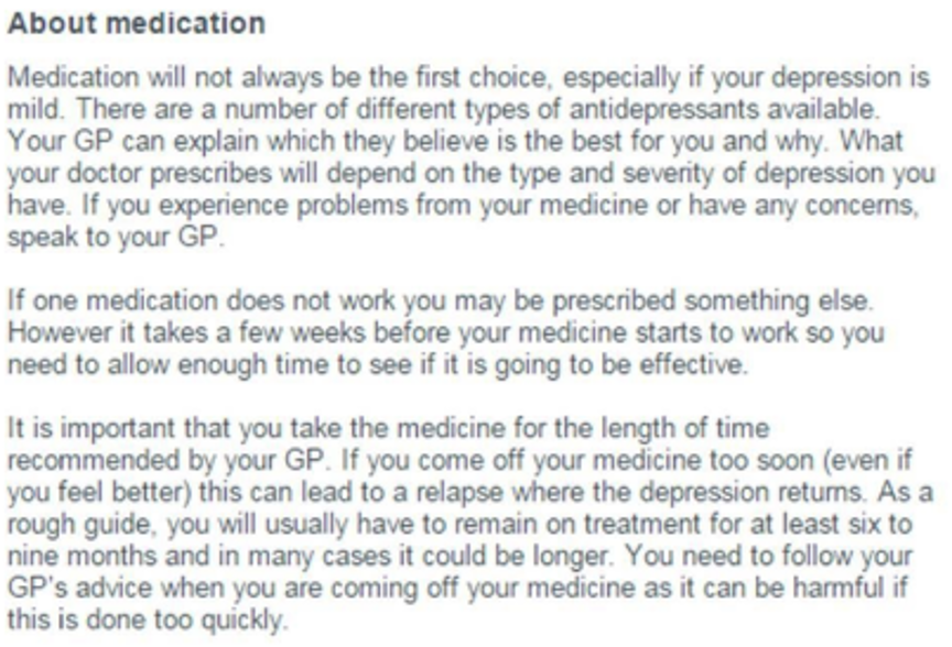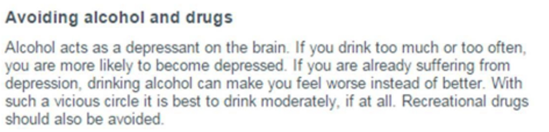 The website also states that both alcohol and recreational drugs should be avoided if you are already suffering from depression. This is due to alcohol acting as a depressant on the brain, therefore making you feel worse instead of better.