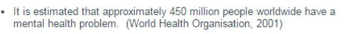 Globally, the mental health website, and the World Health Organisation (WHO) state that there are an estimated 450 million people that suffer form a mental health problem. This shows that mental illnesses are a common problem across the world, not just in specific countries or societies.