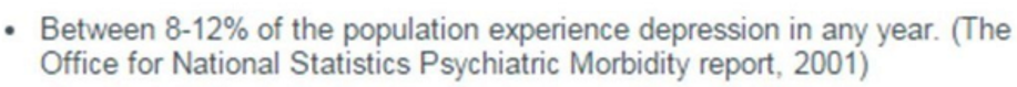It is also worth considering that in any year (according to the Office for National Statistics Psychiatric Morbidity report of 2001) between 8-12% of the population can experience depression. This is also another significant statistic as it shows that a considerable proportion of the UK population can suffer from depression, showing that it is in fact a common illness, and should be recognised as such.