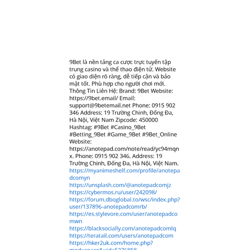 Website: https://anotepad.com/note/read/yc94mqnx. 9Bet là nền tảng ca cược trực tuyến tập trung casino và thể thao điện tử. Website có giao diện rõ ràng, dễ tiếp cận và bảo mật tốt. Phù hợp cho người chơi mới. Thông Tin Liên Hệ: Brand: 9Bet Website:
