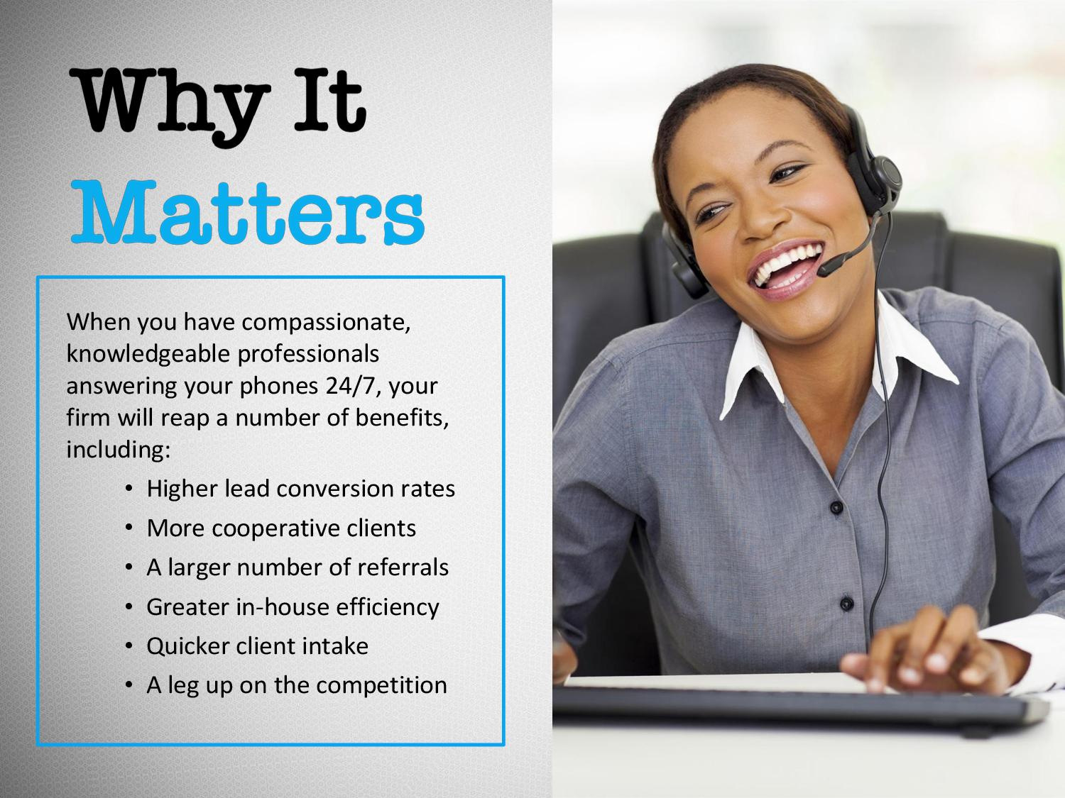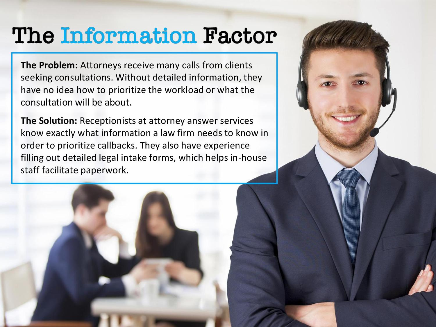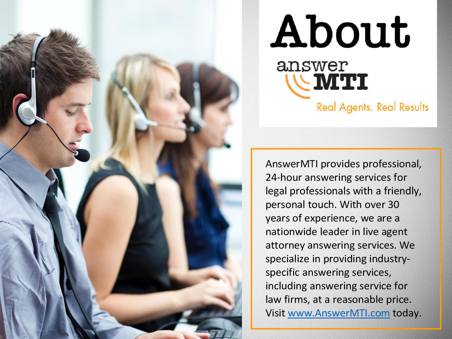 http://www.answermti.com/attorney-answering-service/ | Law firms across the nation are turning to professional answering services to free up in-house resources. That allows secretaries, paralegals, and office assistants to deal with more pressing issues. The only problem? Law firms have special needs. Your average phone operator has neither the training nor the resources to handle sensitive calls. Enter the attorney answering service.