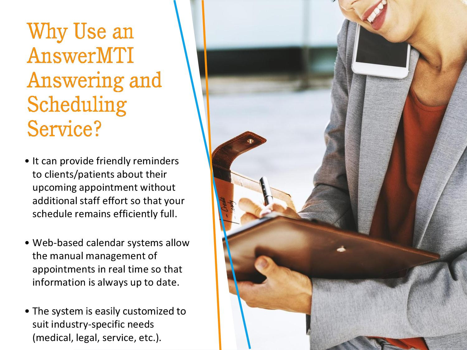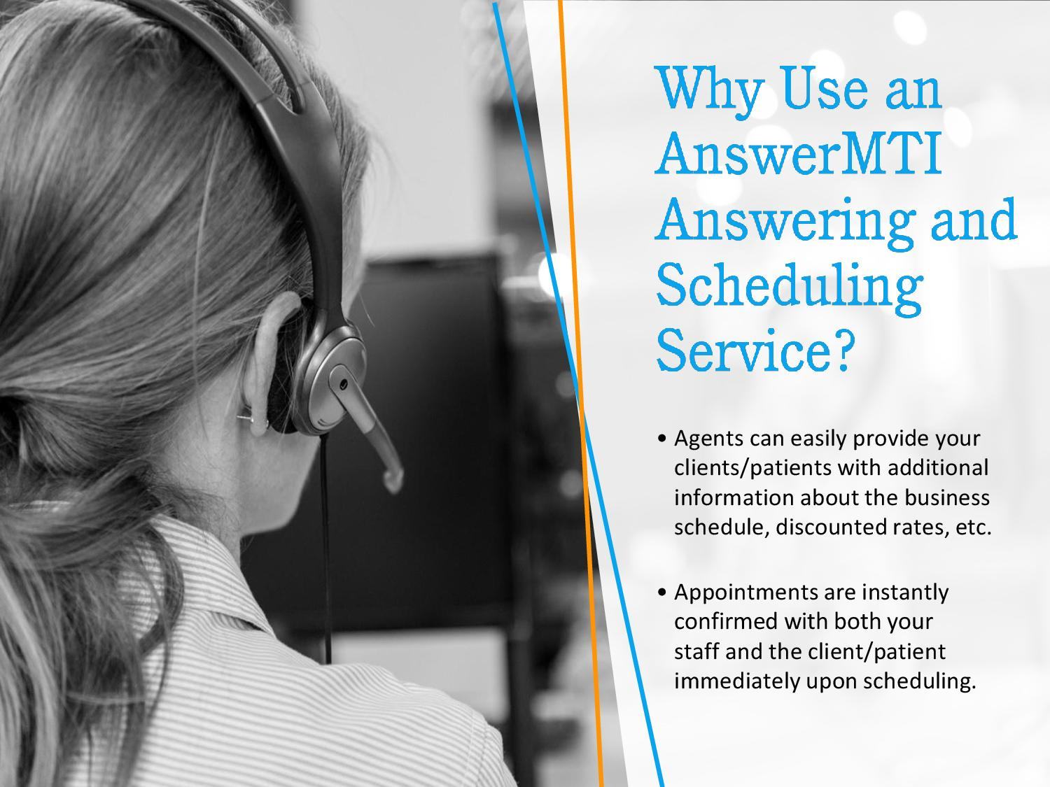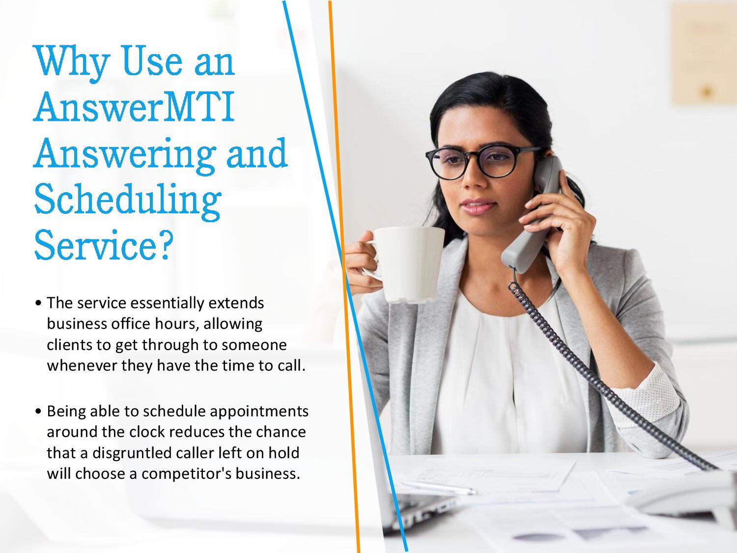 http://www.answermti.com/appointment-setting/ | Regardless of the industry, businesses are always seeking better ways to address customer phone calls and appointment requests. This presentation explores how AnswerMTI Answering and Scheduling services address these concerns.