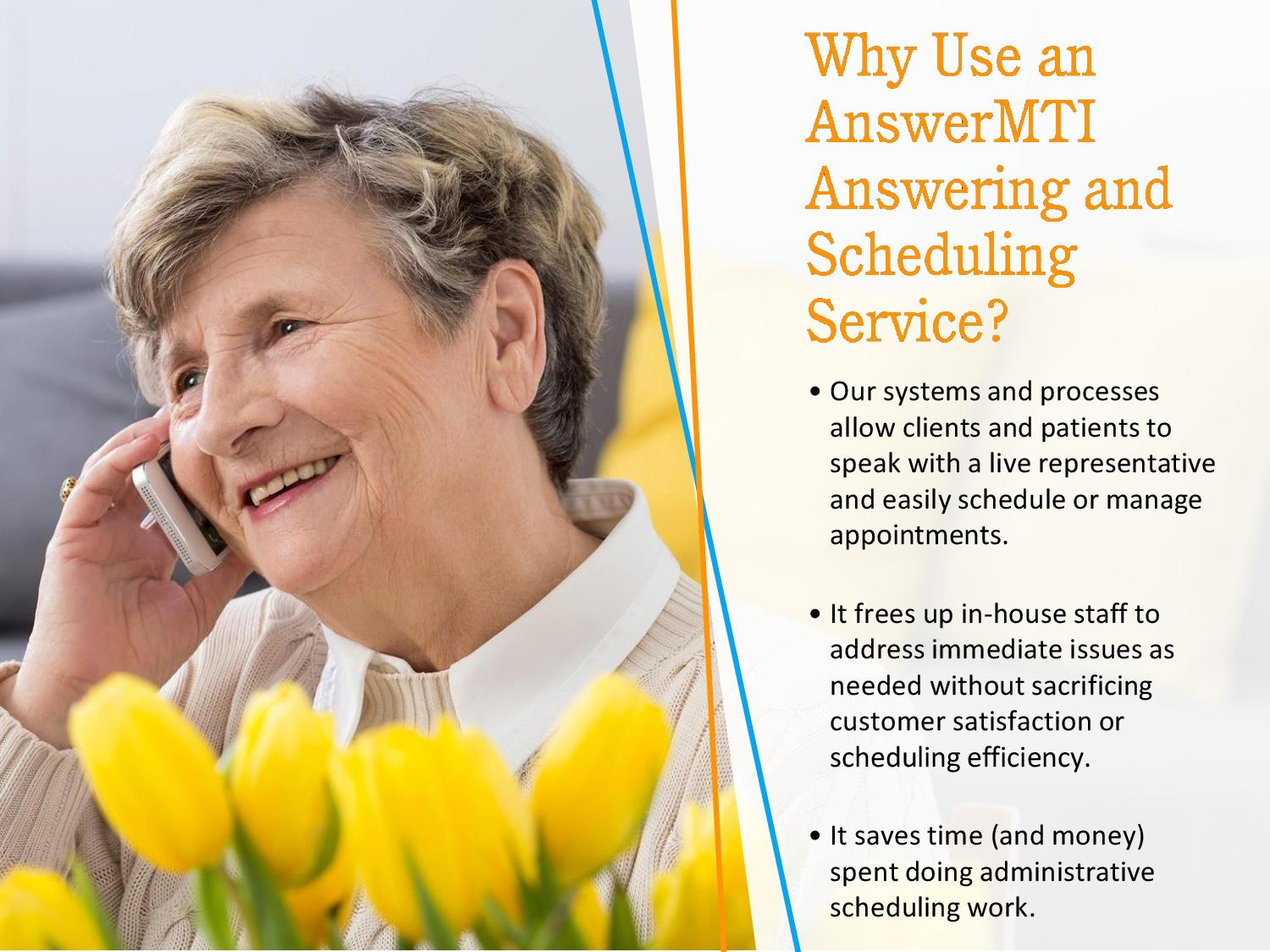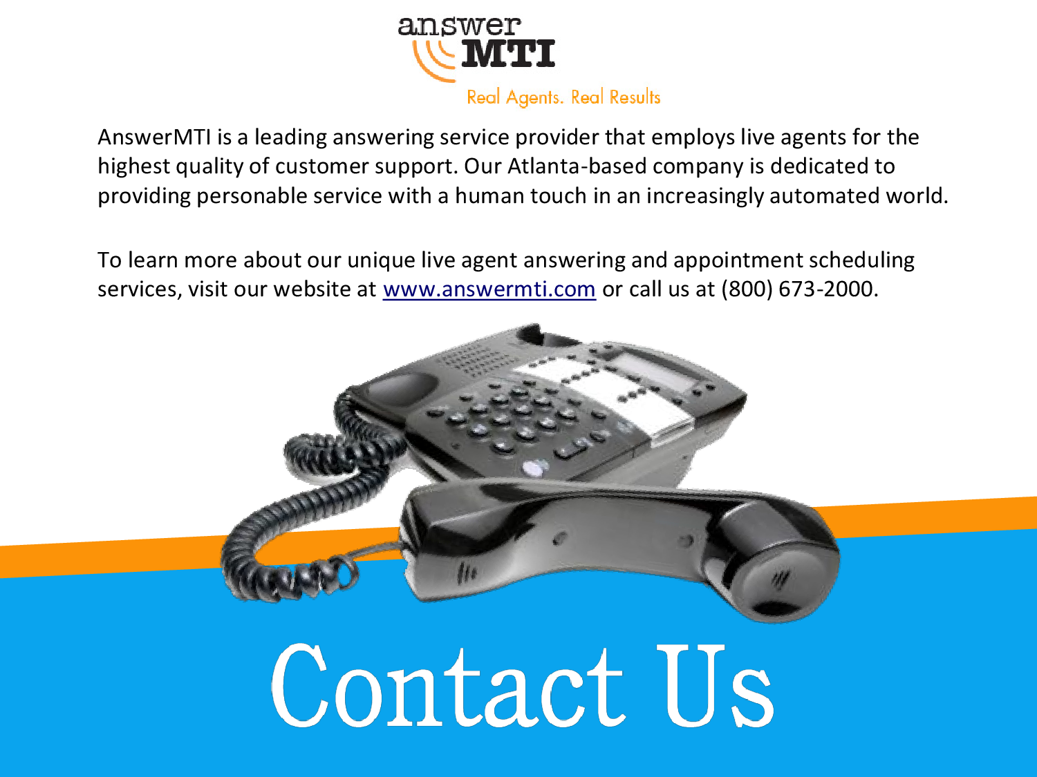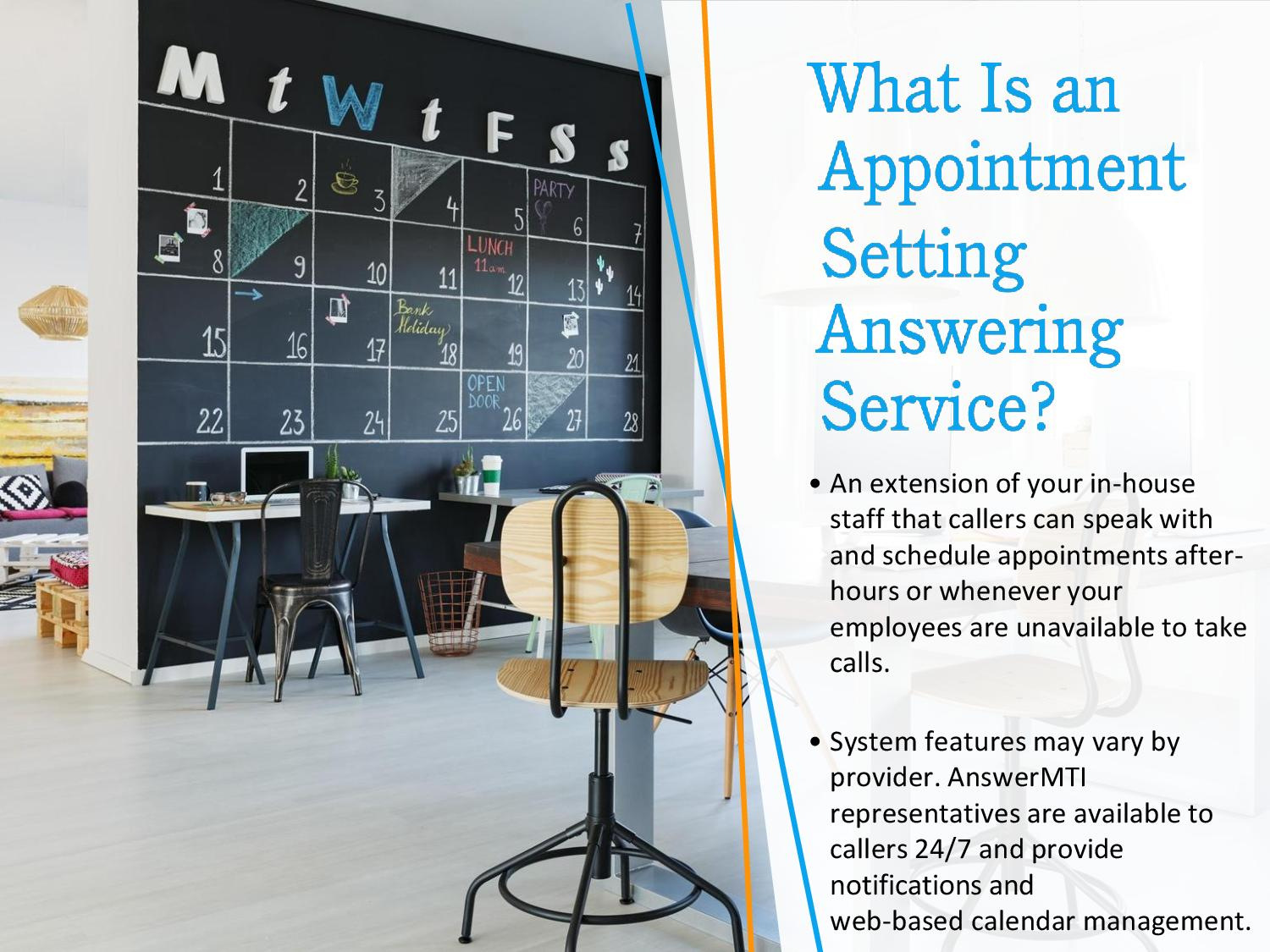 http://www.answermti.com/appointment-setting/ | Regardless of the industry, businesses are always seeking better ways to address customer phone calls and appointment requests. This presentation explores how AnswerMTI Answering and Scheduling services address these concerns.