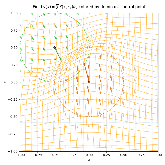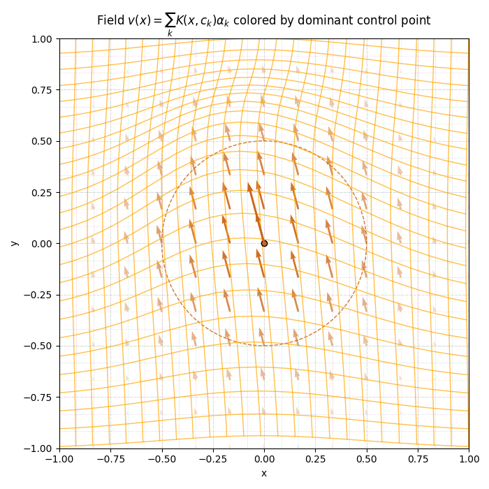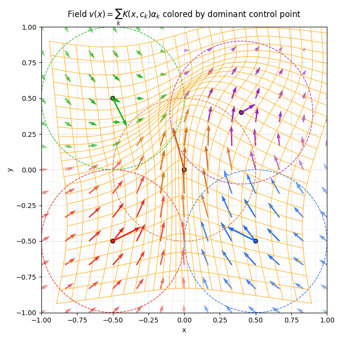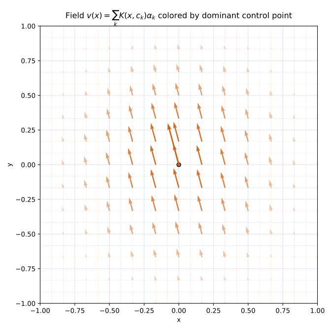\[ v(t,x) = \sum_{k=1}^{N} K(x, c_k(t)) \alpha_k(t) \]
