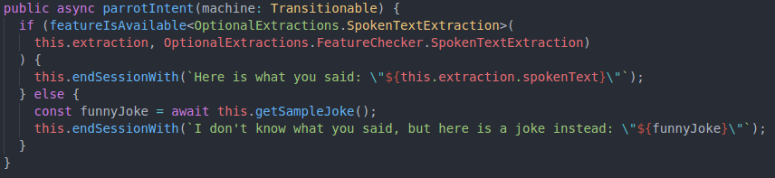 - App starts the conversation with "How was your day?" and understands goodDayIntent and badDayIntent