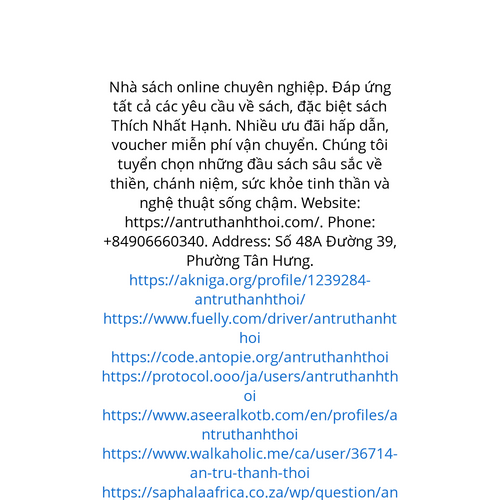 Website: https://antruthanhthoi.com/. Nhà sách online chuyên nghiệp. Đáp ứng tất cả các yêu cầu về sách, đặc biệt sách Thích Nhất Hạnh. Nhiều ưu đãi hấp dẫn, voucher miễn phí vận chuyển. Chúng tôi tuyển chọn những đầu sách sâu sắc về thiền, chánh niệ