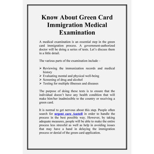 A medical examination is an essential step in the green card immigration process. A government-authorized doctor will be doing a series of tests. There are various parts of the examination include Screening of drug and alcohol, Testing for multiple illnesses and diseases, and Screening of drug and alcohol. For more information, visit the website.
