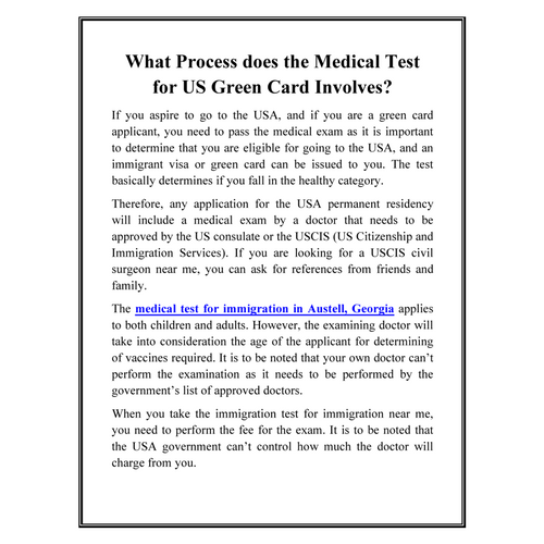 If you aspire to go to the USA, and if you are a green card applicant, you need to pass the medical exam. The medical test for immigration Austell GA applies to both children and adults. However, the examining doctor will take into consideration the age of the applicant for determining of vaccines required. To know more, visit the website.