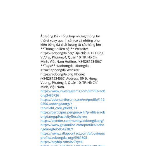 Website: https://aobongda.org. Áo Bóng Đá - Tổng hợp những thông tin thú vị xoay quanh sân cỏ và những phụ kiện bóng đá chất lượng từ các hãng lớn **Thông tin liên hệ:** Website: https://aobongda.org/ Địa chỉ: 89 Đ. Hùng Vương, Phường 4, Quận 10, TP.