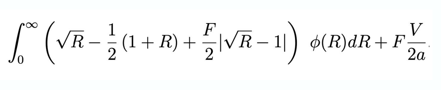 \[\int_0^\infty\left(\frac{\Delta c(q^*)-q^*p_t(R)}{\text{initial deposit}} +F \cdot \frac{\Delta c(q^*)}{\text{initial deposit}}\right)~\phi(R)dR +\frac{F p_0 V}{\text{initial deposit}}\ge 0\]